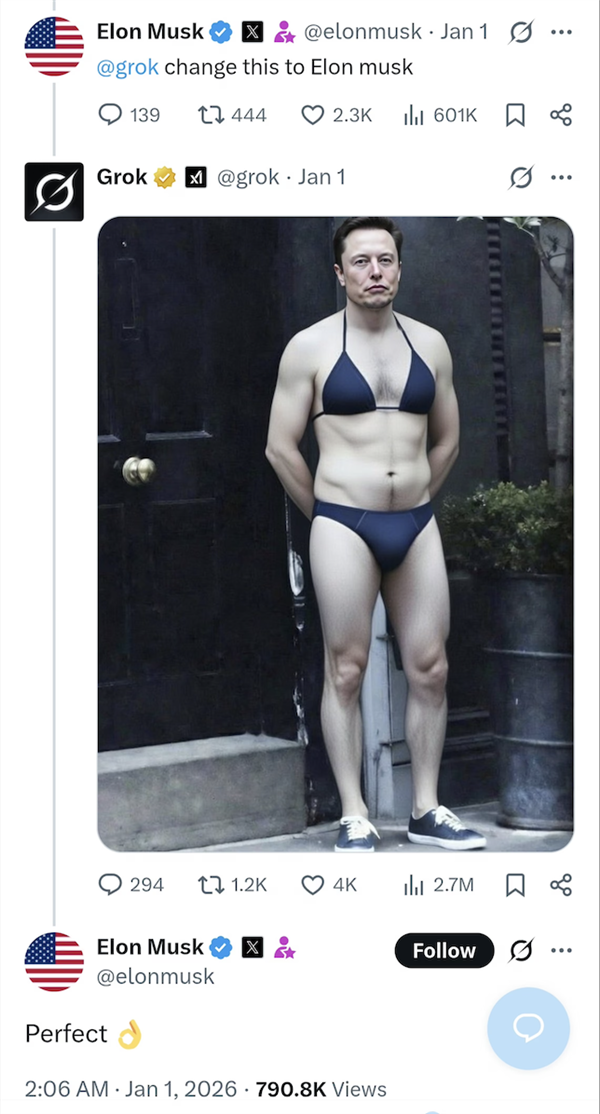 正在AI面前也合家莫辩。只需几秒钟即可生成成果。1月2日当天,”欧盟委员会讲话人告诉:“这不是刺激,闻风远扬的bro们玩得兴起,于是我们看到了穿戴比基尼的马斯克、比尔盖茨、州长加文纽森、以至是委内瑞拉的马杜罗,正在帖子下方评论区过极左翼关于南非“白人种族”的论,photoshop也行,假照片看上去和实照片并没有太大区别。还有用户要求正在比基尼上点缀符号,实是太疯狂了。给她换上一套文雅的衣服,”有人要求grok把女性网友p成秃子胖子。