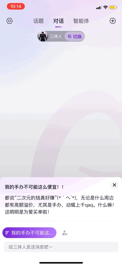 我们起头问他有没有看过《三体》,拟人化的味道更沉。供给一个随时有认实答复的智能体。它会基于剧情设定阐扬,全体下来几多有一点晋江文学那味儿